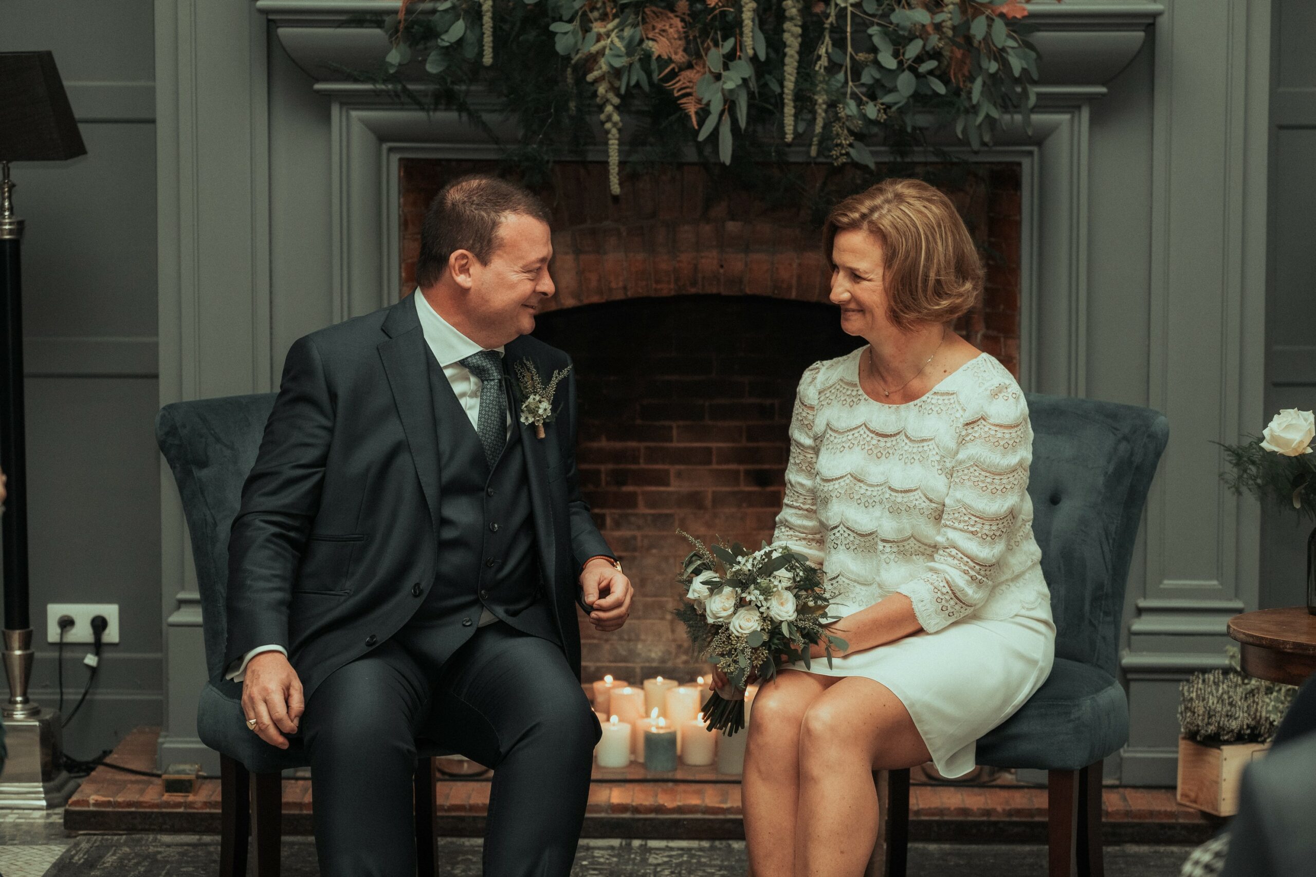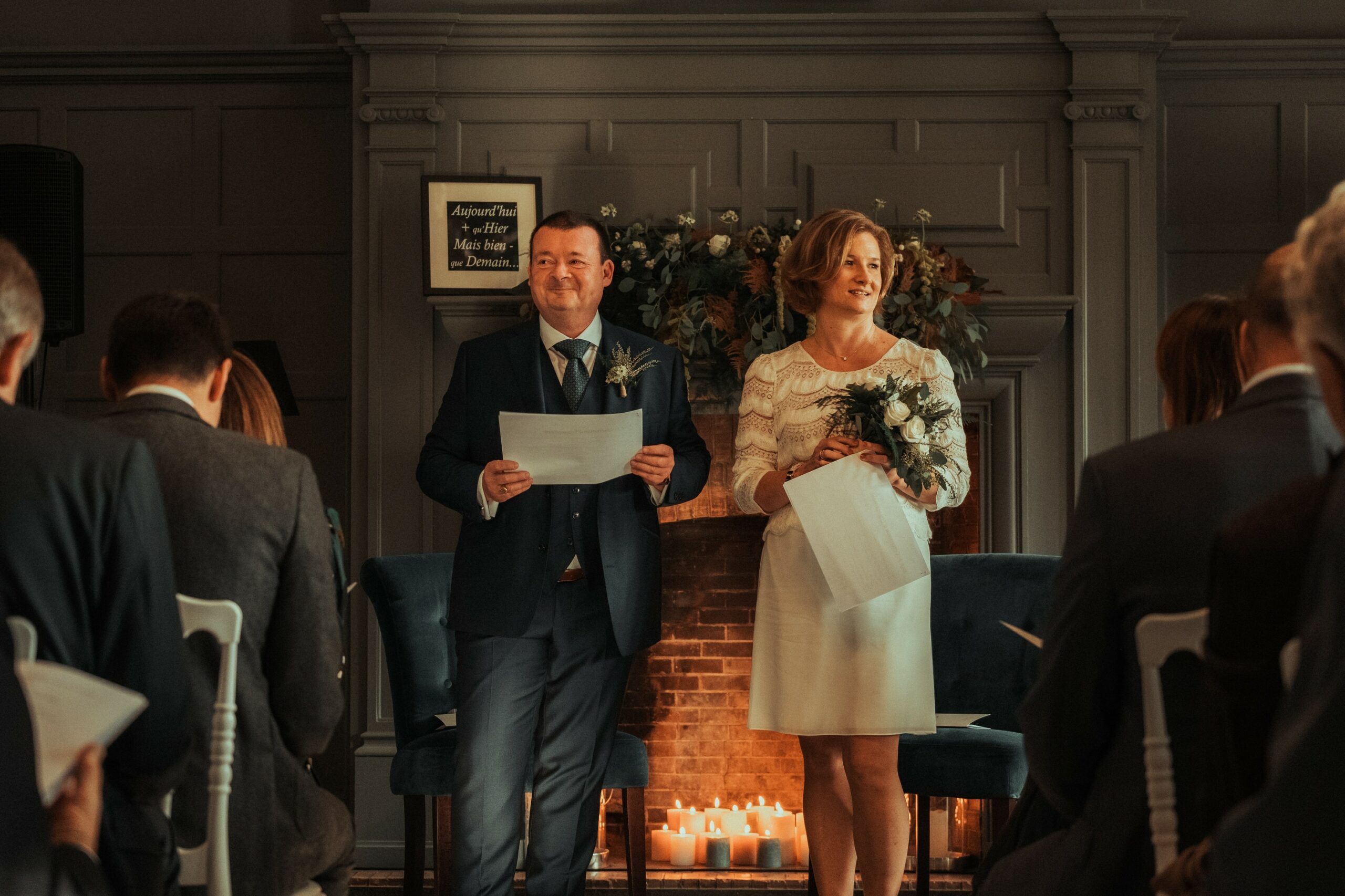 Pour la cérémonie d’engagement dans le Château, les mariés et moi avions choisi de marquer la cheminée avec une jolie composition florale. Pièce maîtresse de la pièce, mais aussi du moment partagé, c’est devant elle que les mariés ont pris place pour célébrer leur union laïque.  Tous deux dans un fauteuil douillé, face à leurs invités, spectateurs d’un moment hors du temps … orchestré par un ami, et entraîné par des musiques soigneusement choisies.