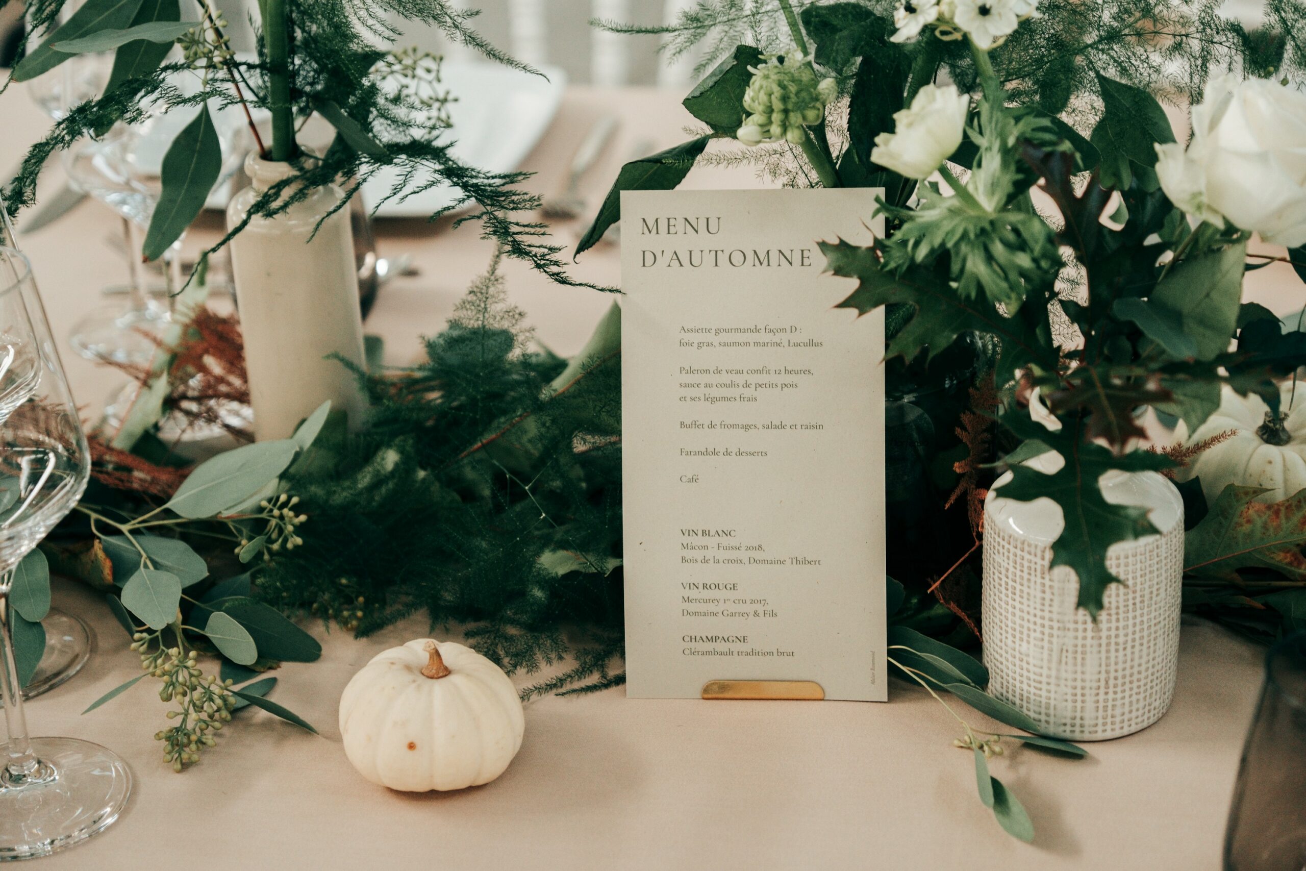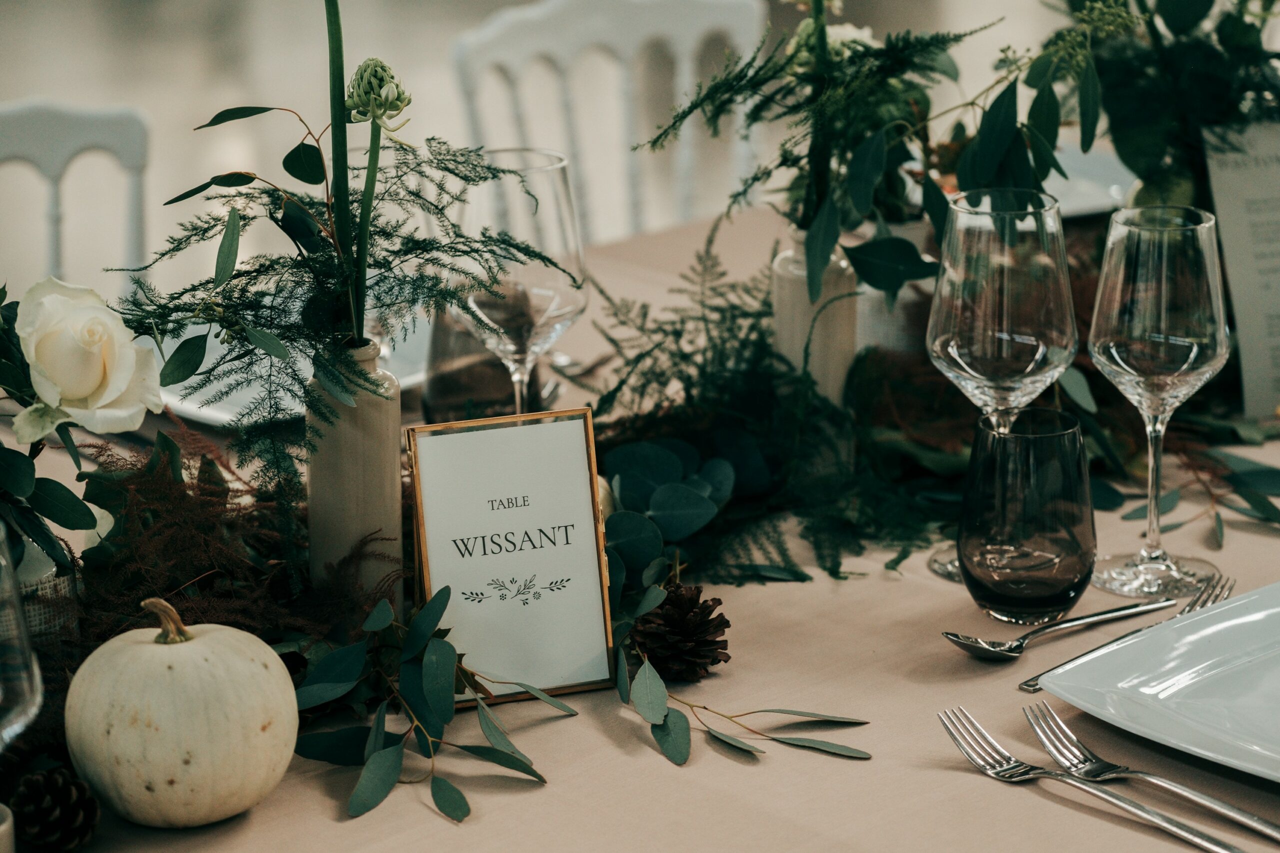 Les tables ont été décorées avec sobriété et pour faire parler la nature :  compositions florales remarquables, feuillages, coloquintes, pommes de pin …