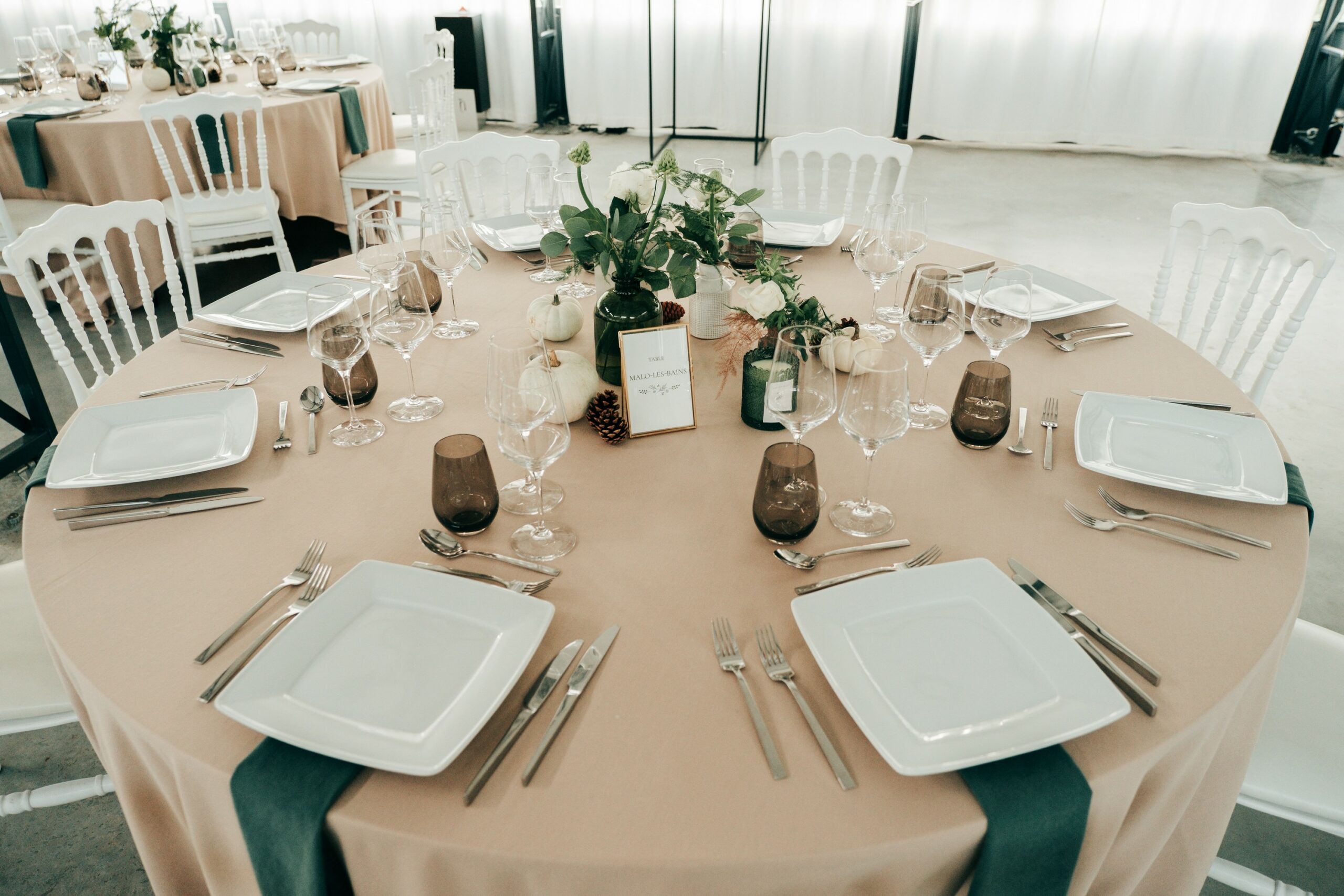 Tout d’abord, Anne avait choisi des nappes couleur sable, un compromis parfait que j’ai validé tout de suite pour donner le ton de la réception.