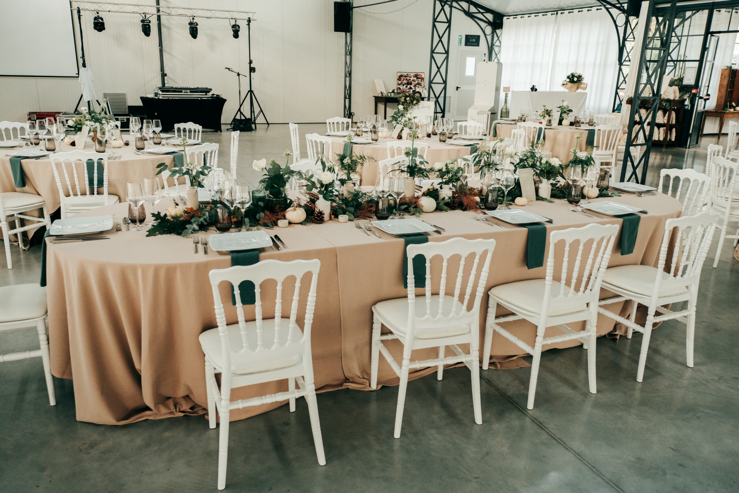 Des teintes parfaites pour rompre avec le côté brut rendu par les structures métalliques de l’Orangerie, et pour réchauffer ce grand espace. Comme l’été laisse place à l’automne, j’avais envie de créer une ambiance éphémère, aux saveurs réconfortantes.